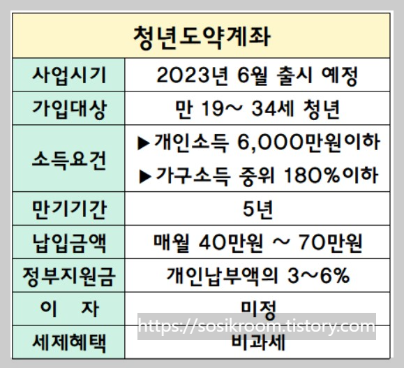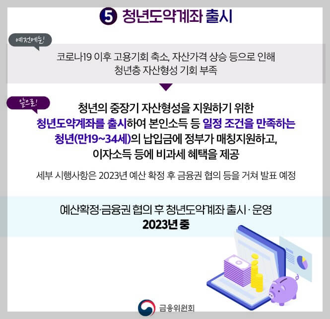 하지만 지금까지 정부에서 발표한 내용은 처음 공약과는 다른데요. 오늘은 지금까지 정부에서 발표한 내용을 토대로 2023년 청년도약계좌 조건과 신청기간에 대해 알아보도록 하겠습니다.