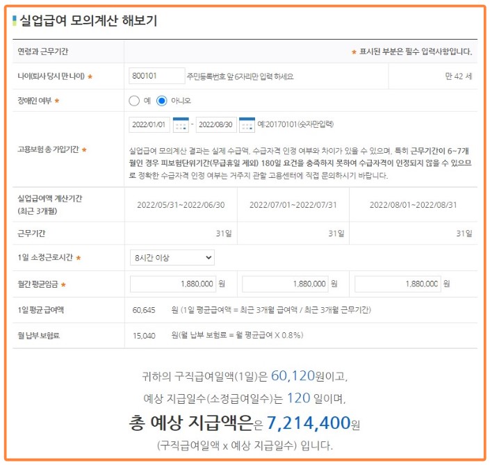 고용보험 사이트에서 실업급여자격 모의 확인이 가능합니다.