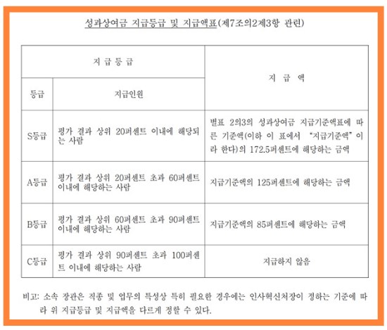 B등급(상위 60~90%) 지급기준액의 85%, C등급(상위 90~100%)은 지급액이 없으나 소속장관은 업무의 특성상 필요한 경우 인사혁신처장이 정한 기준에 따라 지급등급 및 지급액을 다르게 정할 수 있습니다.
