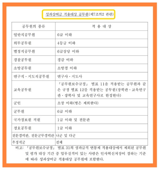 첫 번째로 공무원 성과상여금의 적용대상을 살펴보면 일반직 공무원 6급이하를 비롯해 소방공원 소방경 이하, 교육공무원 고등학교 이하