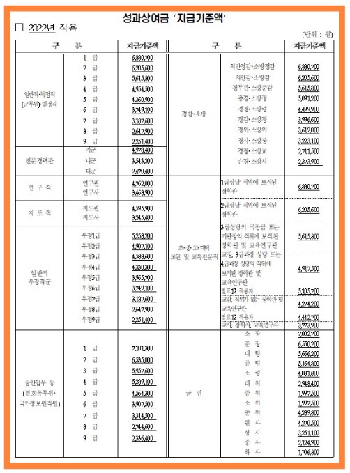 공무원 성과상여금의 지급기준액이 가장 궁금하실텐데요. 2022년 기준 일반직 9급 공무원의 경우 2,251,400원 8급 공무원 2,647,900원 7급 공무원 3,187,600원입니다. 지급 기준액에 지급액의 퍼센트를 곱하면 해당 등급에 대해 최종 지급되는 성과상여금이 나옵니다.