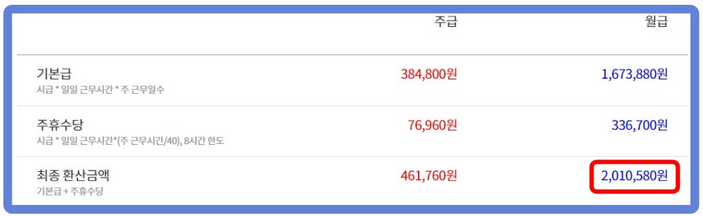 주급 = 5일 급여 9,620원 x 40시간 + 76,960원 = 461,760원