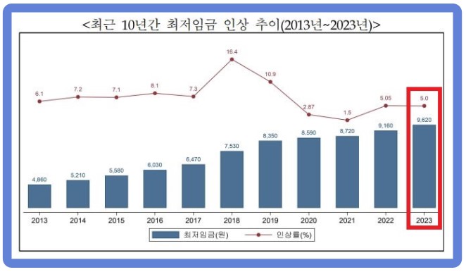2023년 최저임금은 시간당 9,620원입니다. 2022년 최저임금 9,160원 대비 5%(460원)가 인상되었네요. 인상률 5%는 기획재정부, 한국은행, 한국개발연구원(KDI) 등 3개 기관의 경제성장률과 물가상승률 전망치 등을 반영하여 결정했다고 합니다.