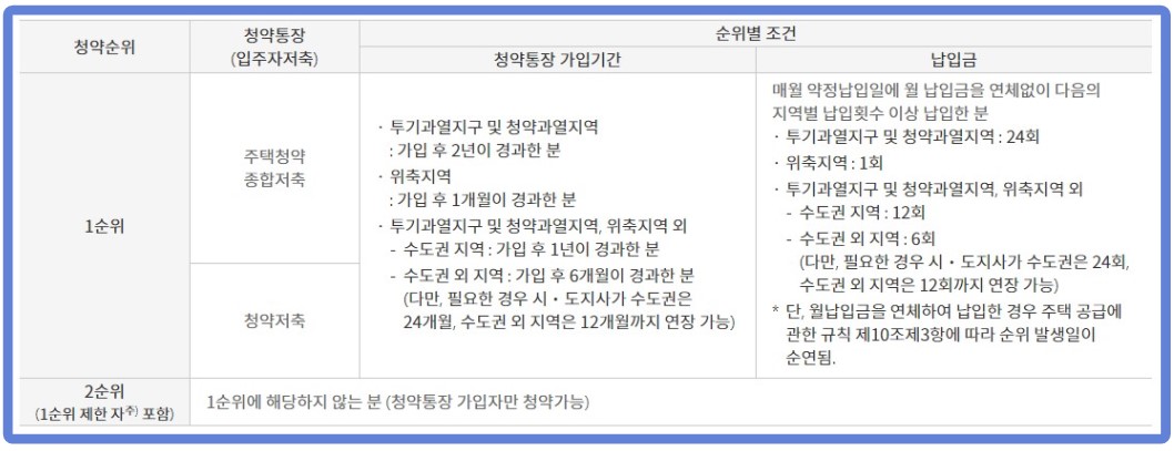 투기과열지구, 청약과열지구의 경우 청약통장 가입기간이 2년, 납입 횟수가 24회 이상이 되어야 1순위가 될 수 있습니다. 투기과열지구 및 청약과열지구가 아닌 지역 중 수도권은 청약통장 가입기간 1년, 납입 횟수 12회 이상이 되어야 합니다.