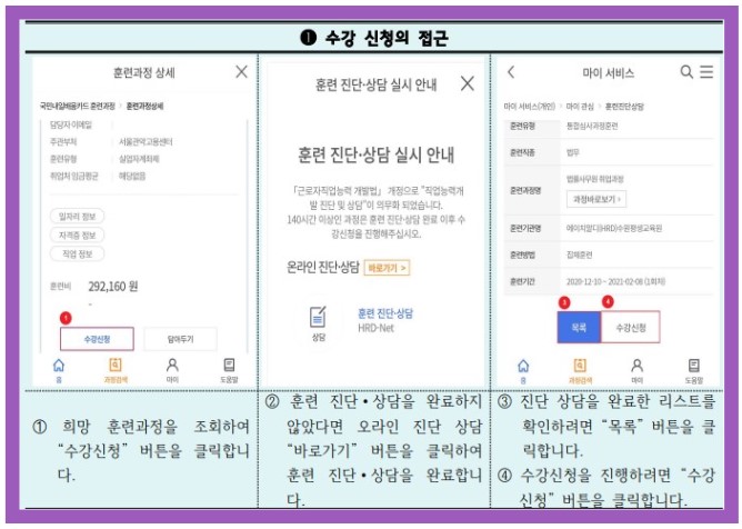 ※ 자부담금이 있는 훈련과정의 경우 훈련 기관 방문 후 자부담금을 결제해야 최종 등록이 완료됩니다. 또한 체크카드로 신청했을 시 체크카드 연결 계좌에 자부담금액이 들어 있어야 최종결제가 가능합니다.