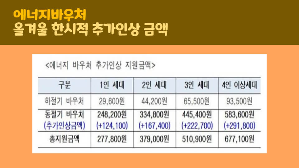 올겨울 에너지 바우처의 금액은 1인가구의 경우 248,200원, 2인 가구 334,800원, 3인 가구 445,400원, 4인 가구 583,600원으로 기존 금액에서 2배로 인상지원됩니다