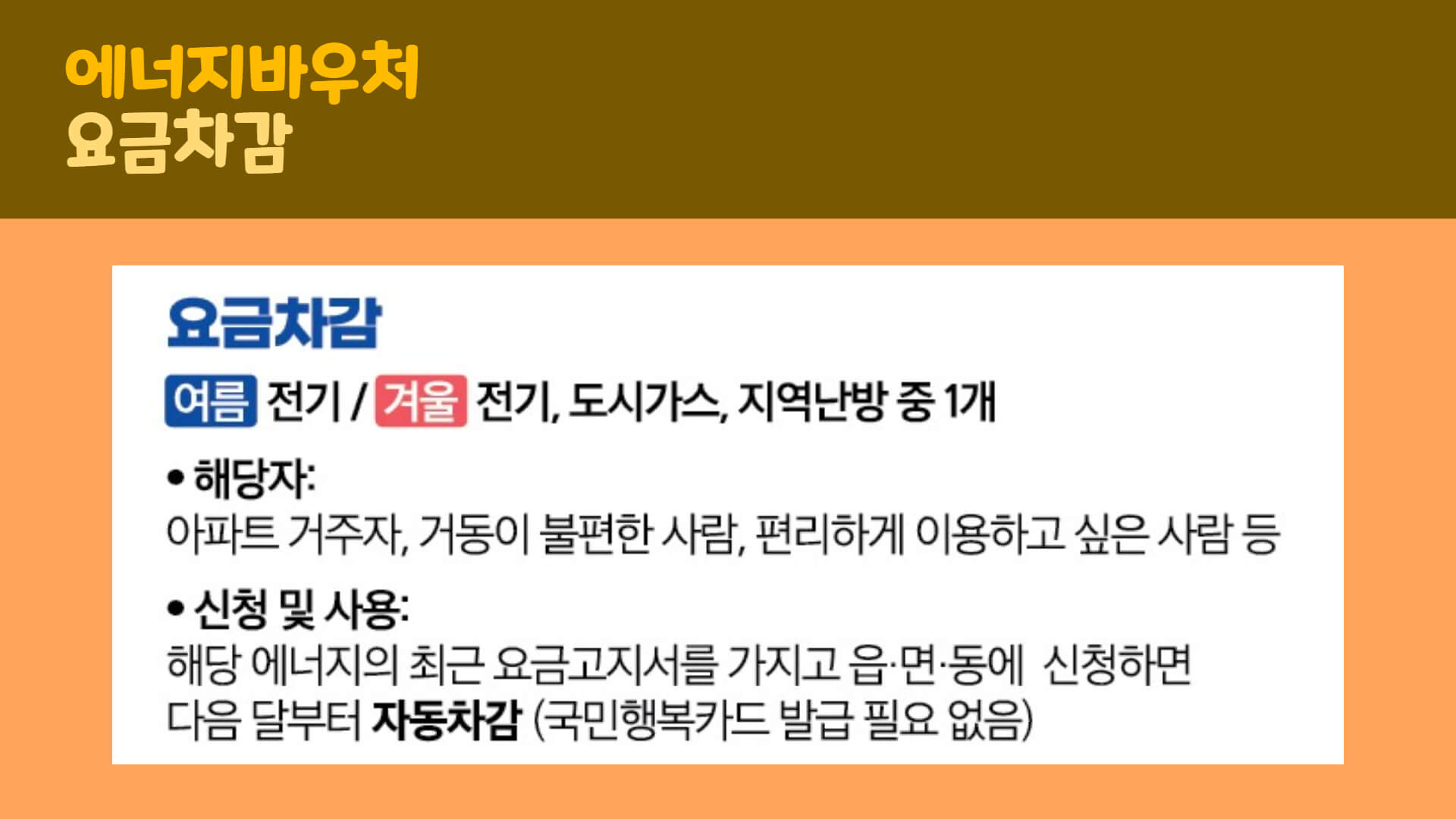 전기, 도시가스, 지역난방 중 1가지를 사용하면서 아파트거주, 거동이 불편한 분이라면 자동차감을 신청하시는게 좋습니다. 역시 행정복지센터에 신청 시 요금 고지서를 함께 제출하신다면 개인이 따로 신청할 것은 없으며 요금 청구시 해당금액이 차감됩니다.