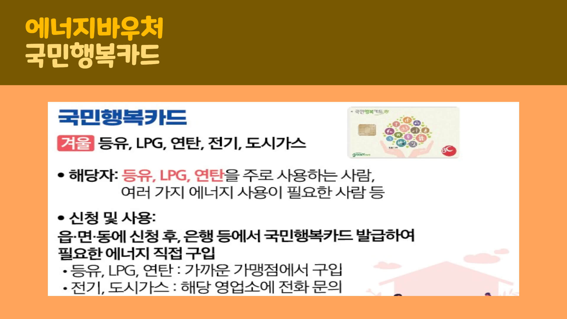 국민행복카드 결제의 경우 등유, LPG, 연탄을 주로 사용하거나, 여러가지 에너지를 사용하는 분이 선택하는 사용방법입니다. 읍면동 행정복지센터에서 에너지바우처를 신청 한 후 은행에서 국민행복카드를 발급하면 됩니다. 카드 발급 후에는 필요한 에너지를 직접 구매 후 결제하면 됩니다.