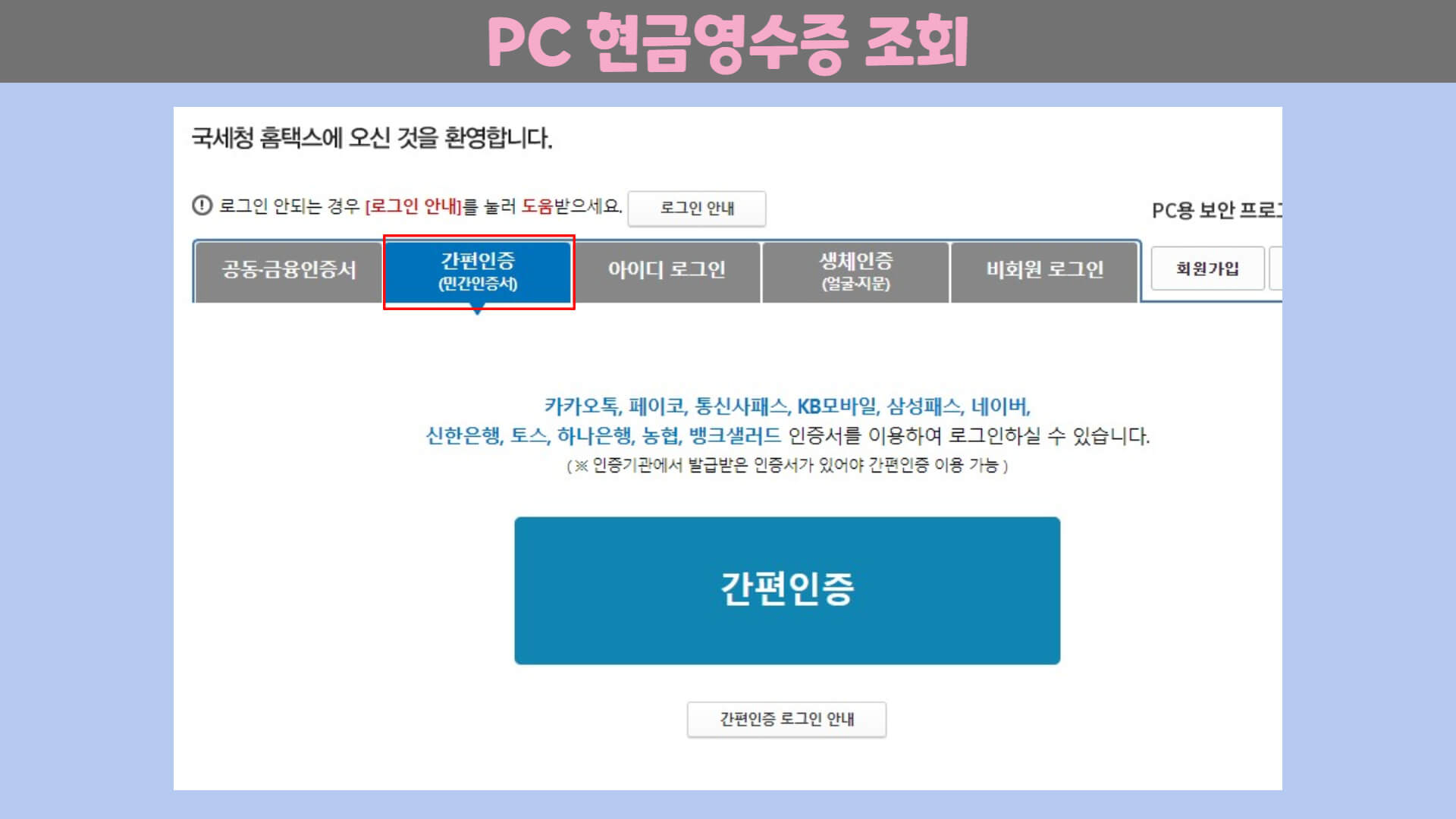 원하는 간편 인증 수단을 선택 후 인증요청을 합니다.