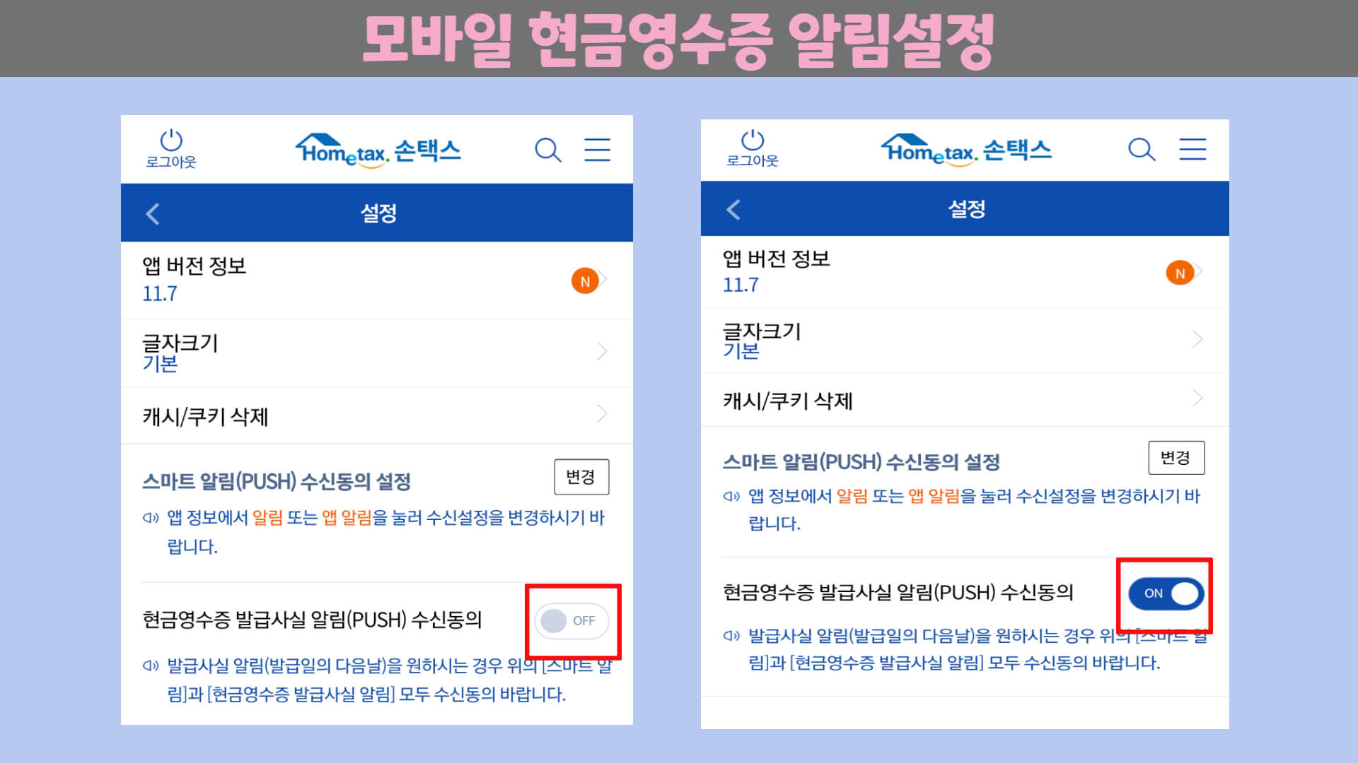 설정 맨 밑의 현금영수증 발급사실 알림 수신동의를 클릭하여 off에서 on으로 바꿔줍니다.