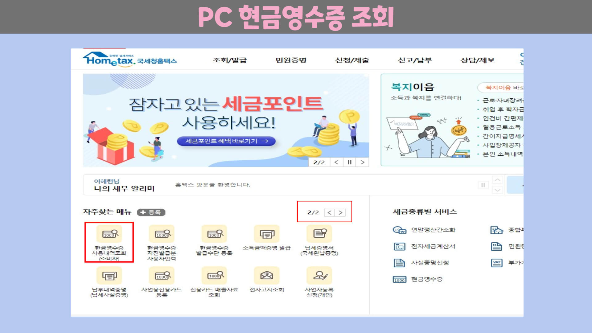 인증 완료 후 메인화면의 자주 찾는 메뉴 2페이지의 현금영수증 사용내역 조회(소비자)를 클릭합니다.