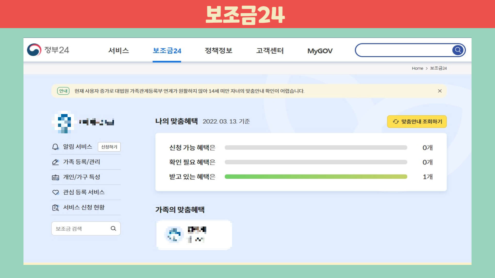 만약 로그인을 하여 보조금 24 서비스를 이용하신다면 좀 더 자세히 나에게 맞는 혜택을 조회할 수 있습니다. 본인뿐만 아니라 가족의 정보도 입력하여 가족이 받을 수 있는 보조금까지 확인해 볼 수 있습니다.