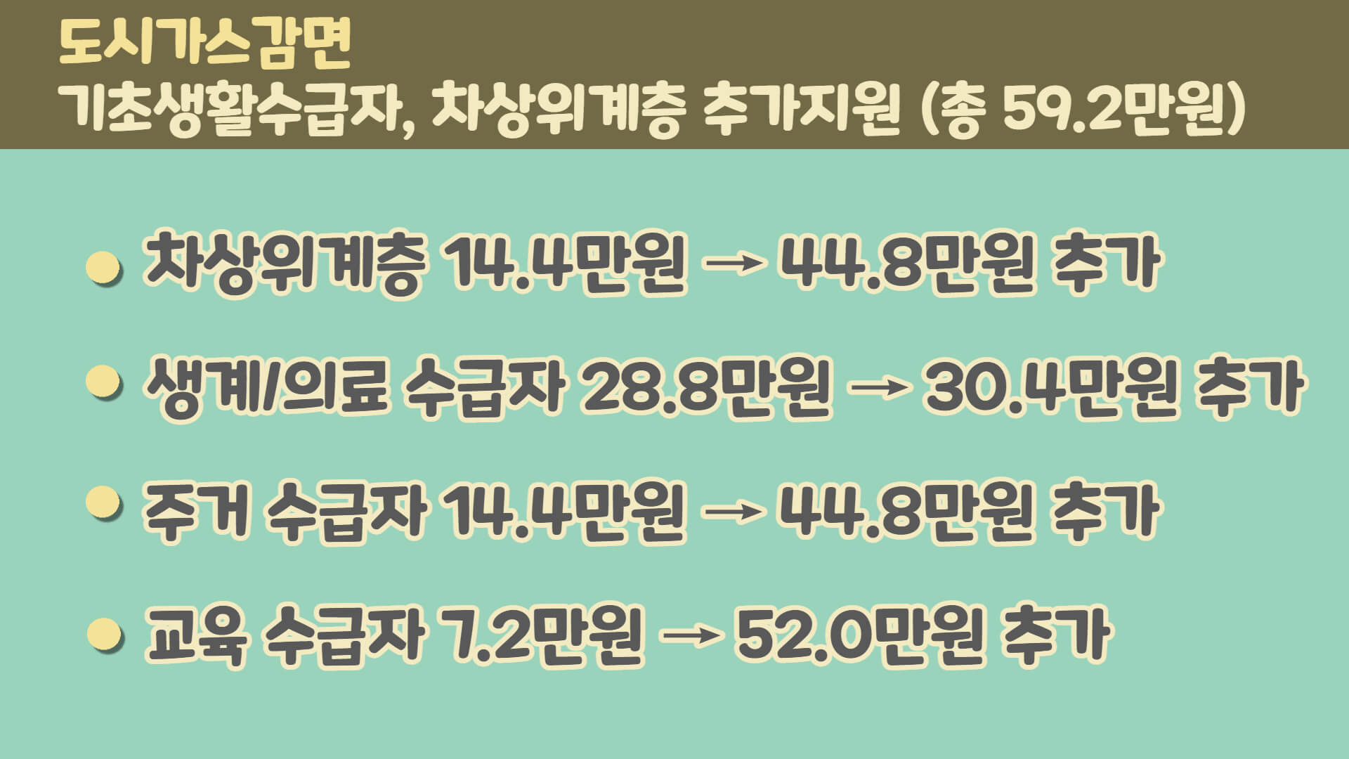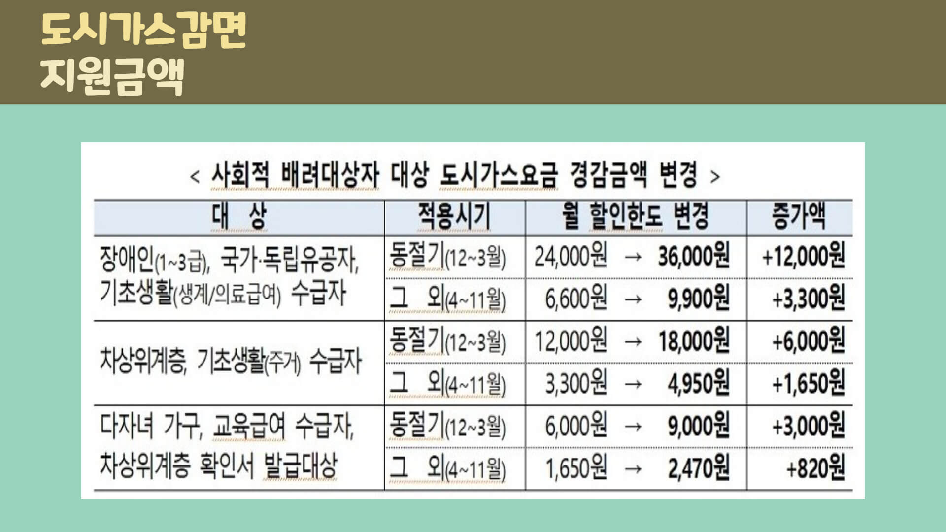도시가스 지원금액은 올겨울 2배로 확대된데 이어 에너지바우처를 받지 못하는 기초생활수급자 및 차상위계층의 경우 592,000원까지 도시가스비를 지원받을 수 있습니다. 이 금액은 23년 3월까지 받을 수 있는 지원받을 수 있는 금액입니다.
