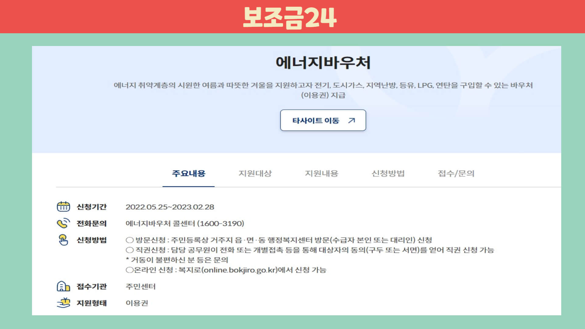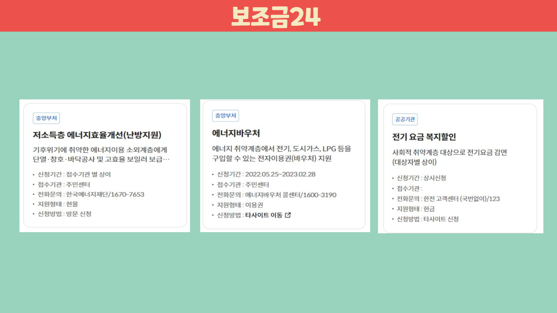 보조금 24에서는 확인가능한 난방비 지원내용은 에너지바우처, 저소득층 에너지효율개선사업, 긴급복지연료비 및 전기요금지원, 전기요금복지할인, 에너지복지요금지원, 저소득층 에너지효율 난방개선 난방지원, 장애인가구냉난방지원 등