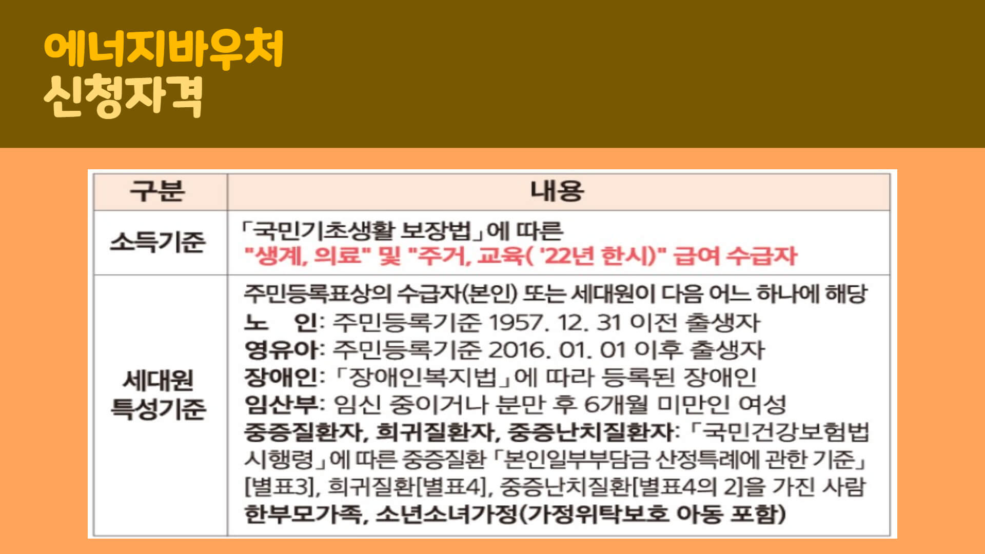 세대원 중 노인(57.12.31. 이전출생), 영유아(16.01.01. 이후출생), 장애인, 임산부, 중증질환자, 한부모가족, 소년소녀가장이있어야 합니다. 특히 주거, 교육급여 수급자는 22년도 한시지원대상자로 23년 2월 28일까지 신청하면 올해 4월까지 에너지 바우처 혜택을 받을 수 있습니다.