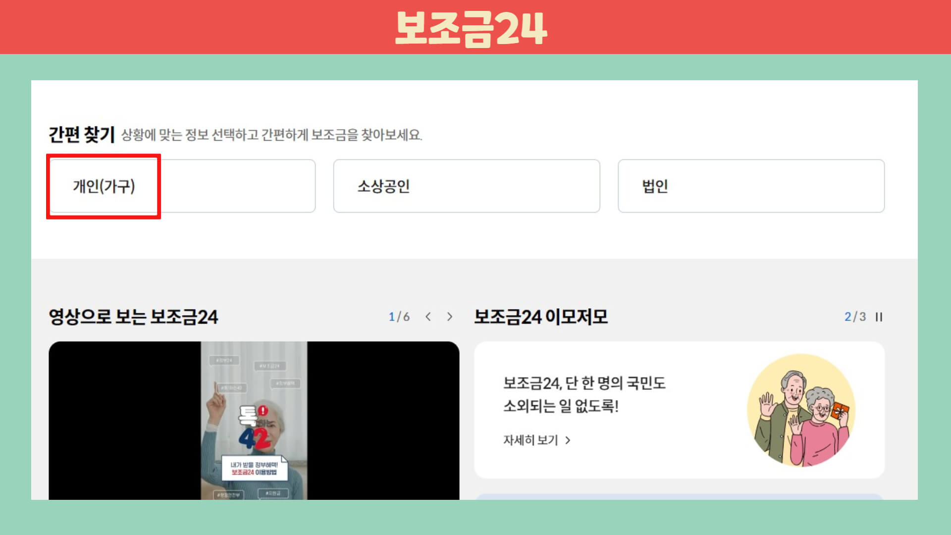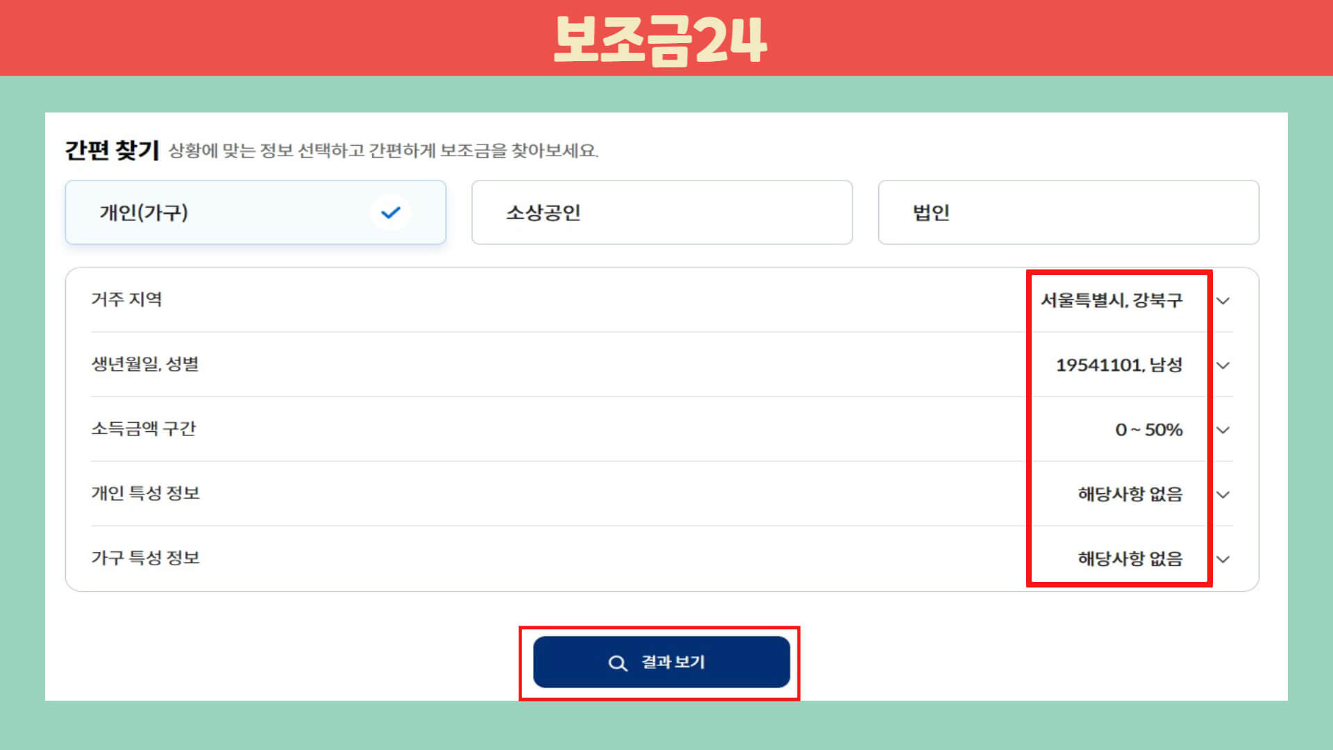 보조금 24 메인 화면 중간쯤 간편 찾기에서 개인을 선택한 후 거주지역, 생년월일, 성별, 소득금액구간, 개인특성정보, 가구 특성정보를 입력합니다.