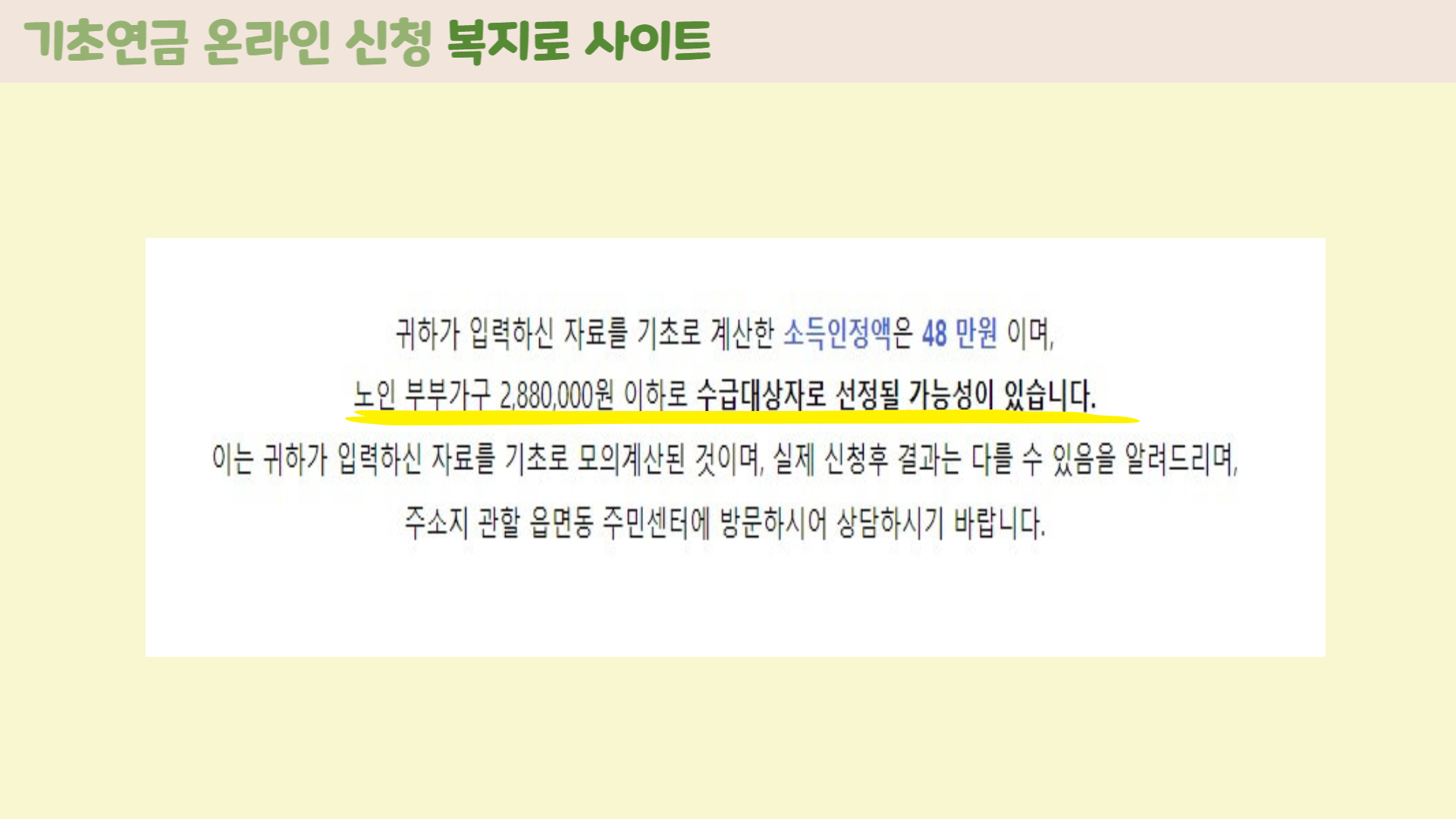 해당 내용을 다 입력하면 소득인정액이 나오고 기초연금 수급가능성에 대해 알려줍니다. 하지만 이 사이트는 말 그대로 모의계산을 위한 것이므로 기초연금 신청을 원하시는 분은 주소지 읍면동 행정복지센터에 방문하여 상담 및 신청을 꼭 하시기 바랍니다.