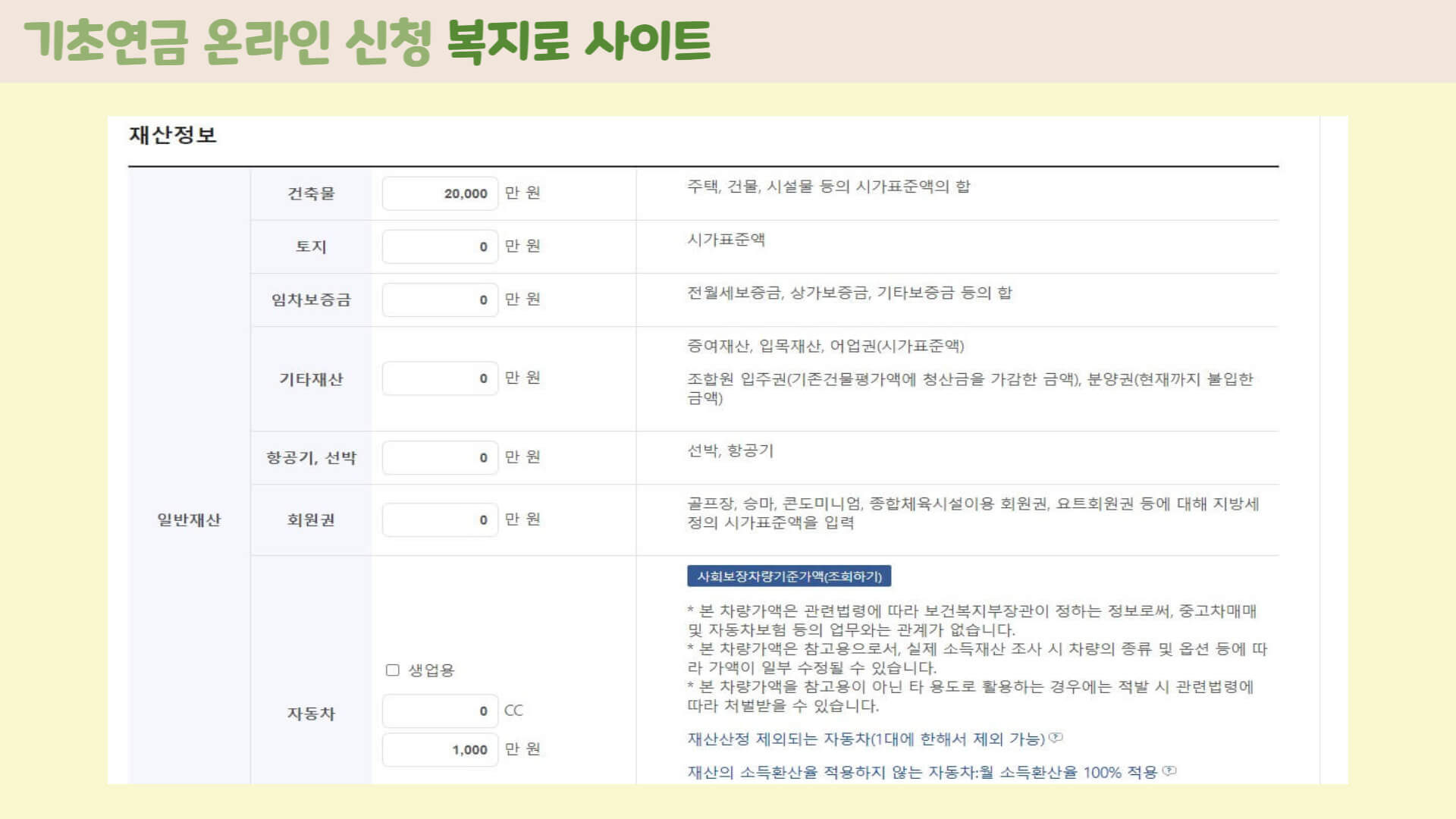 건축물, 토지, 임대차보증금, 자동차, 부채 관련 내용도 입력합니다. 자동차의 경우 오른쪽 칸의 사회보장차량기준가액 조회하기를 클릭해 본인 자동차 금액을 확인할 수 있습니다.