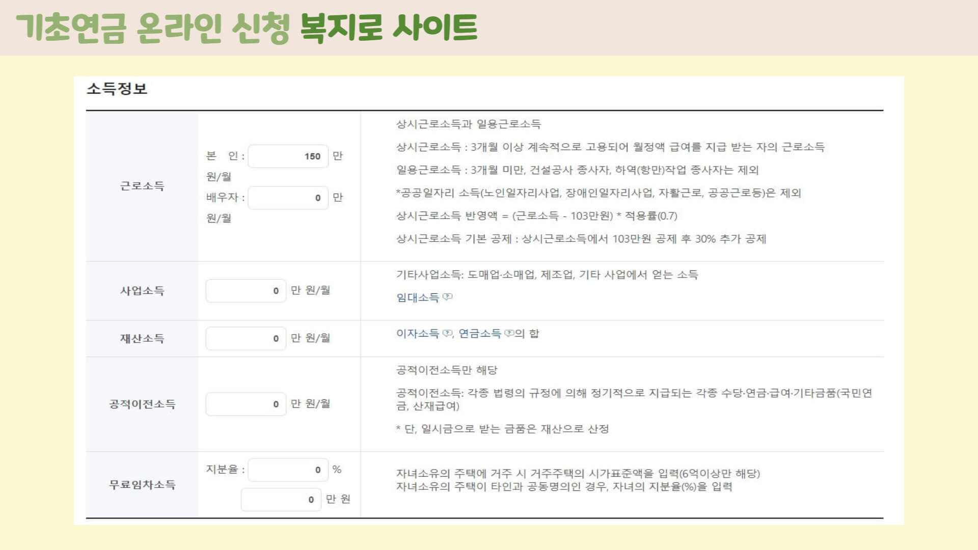 공공일자리소득(노인일자리사업, 장애인일자리사업, 공공근로 등), 자활근로소득(자활근로, 자활공공근로, 자활공동체사업 등)은 근로소득으로 산정하지 않으며 기초생활보장급여, 장애수당, 장애인연금, 양육보조금, 실업급여, 근로장려금, 독립유공자 예우에 관한 법률에 의한 생활지원금 등도 소득에 산정하지 않습니다.