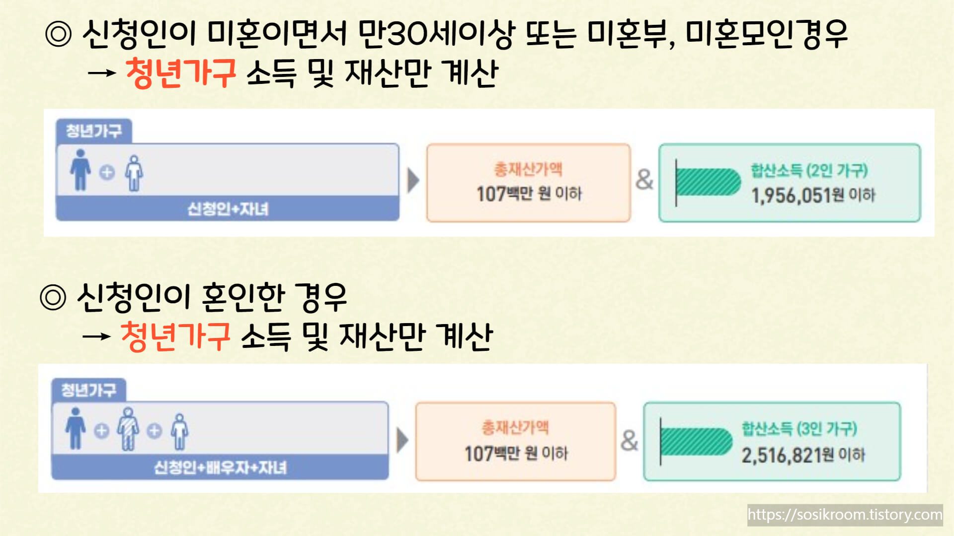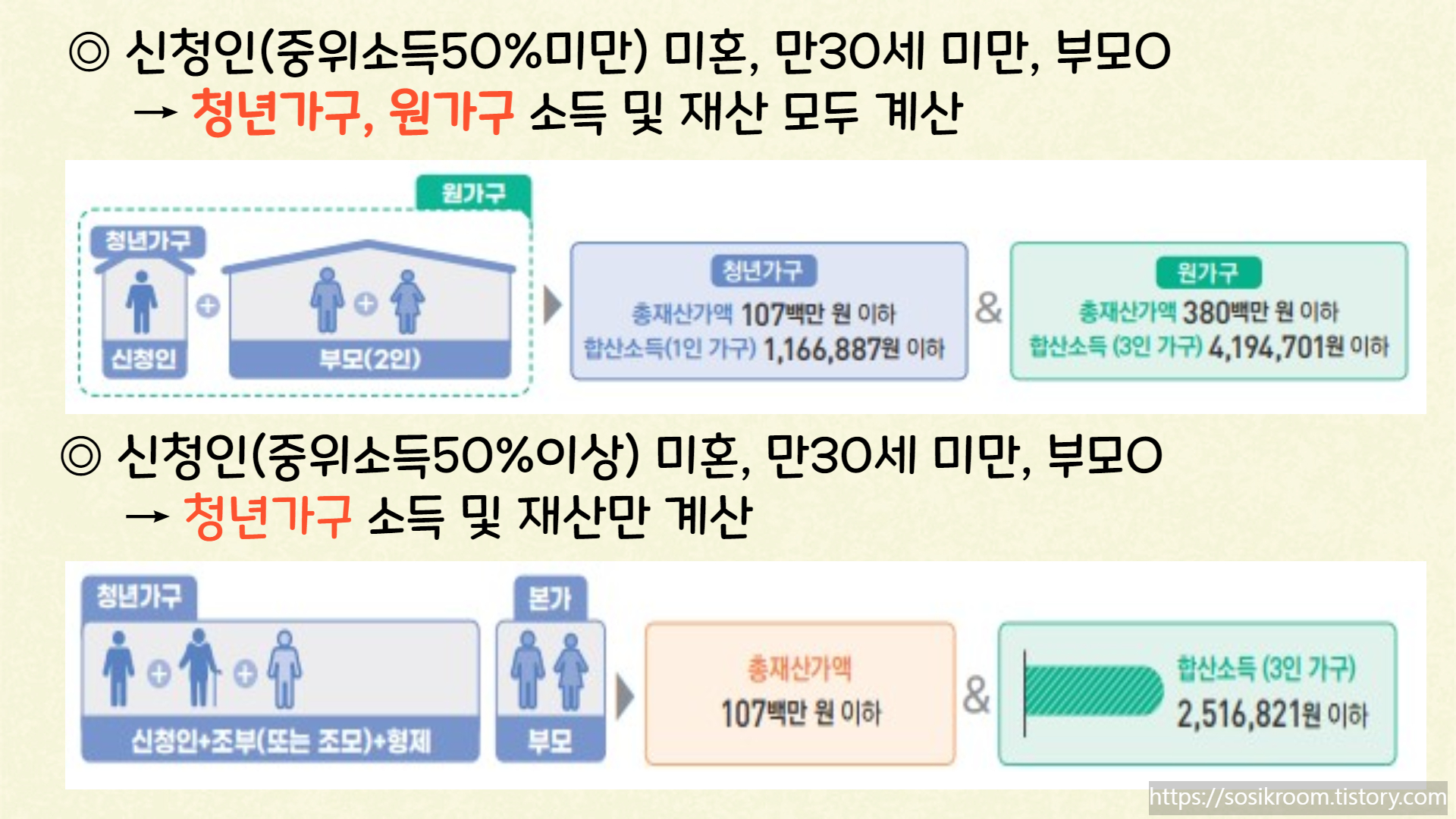 청년원가구의 경우 소득이 기준중위소득 100% 이하이고 재산은 3억 8천만 원 이하여야 합니다. 청년가구의 소득 기준은 중위소득 60% 이하이며 재산은 1억 7백만 원 이하여야 합니다.