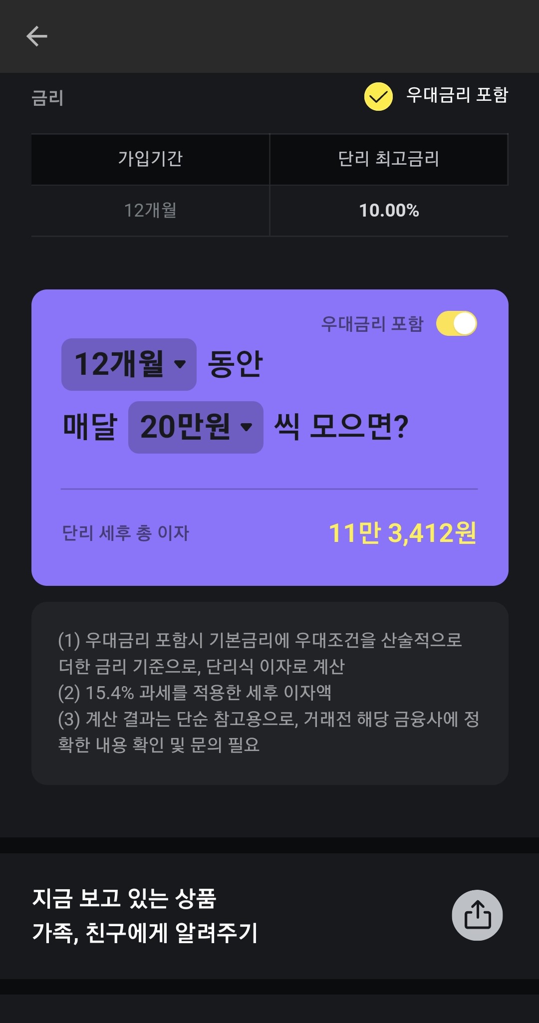 카카오페이 예적금 금리비교 중 제일 좋았던 것은 이자 계산기가 탑재되어 있어 상품 검색과 동시에 만기 시 세금을 제외하고 내가 실제로 받을 수 이자를 바로 알려줍니다. 그리고 해당 은행의 홈페이지로 연결되는 것도 편리합니다.