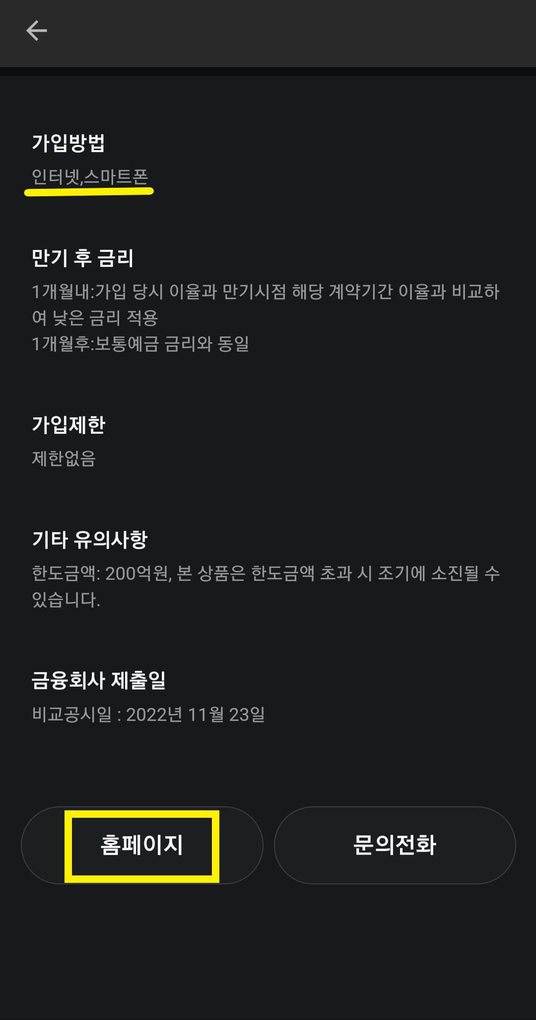 현재 카카오페이 예적금 비교 사이트에서 금리가 가장 높은 정기예금은 동양저축, 상상인 플러스 저축은행의 연 6.10% 상품이네요. 동양저축은행 정기예금상품의 상세 내용을 보니 인터넷으로 가입이 가능하고 12개월, 24개월, 36개월 상품 모두 6.10%가 적용됩니다.